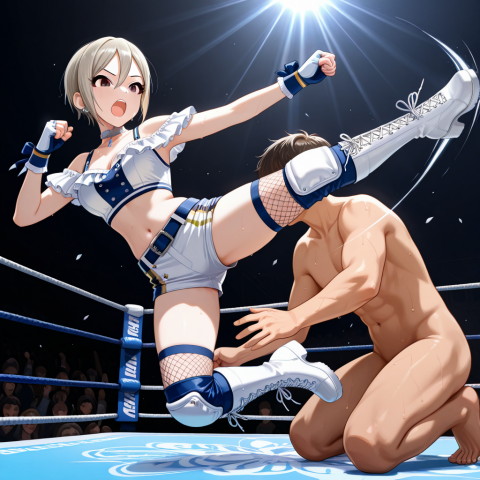 描き分けは優秀なのだけれど、技をかけてる状態を生成しようとすると…、今まで以上にグチャグチャになる感じなのが残念。手の指が溶けてたり、足3本が