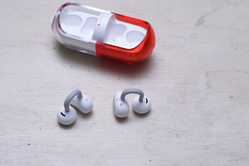 耳に装着すると、丸いスピーカー部分が耳穴のすぐ近くにくるので、耳穴に突っ込むタイプのイヤホンとほぼほぼ変わらん音質で外の音も聴こえる…っての